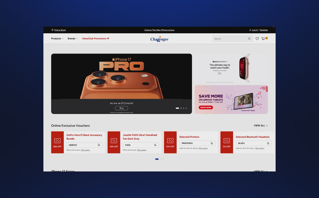 We collaborated with Challenger to craft a modern online store that highlights technology products with clarity and ease of use. Clear product showcases and streamlined navigation make it simple for customers to discover and purchase the latest gadgets. Behind the scenes, an improved backend structure allows the team to manage content and visuals efficiently, keeping the site dynamic and up-to-date.